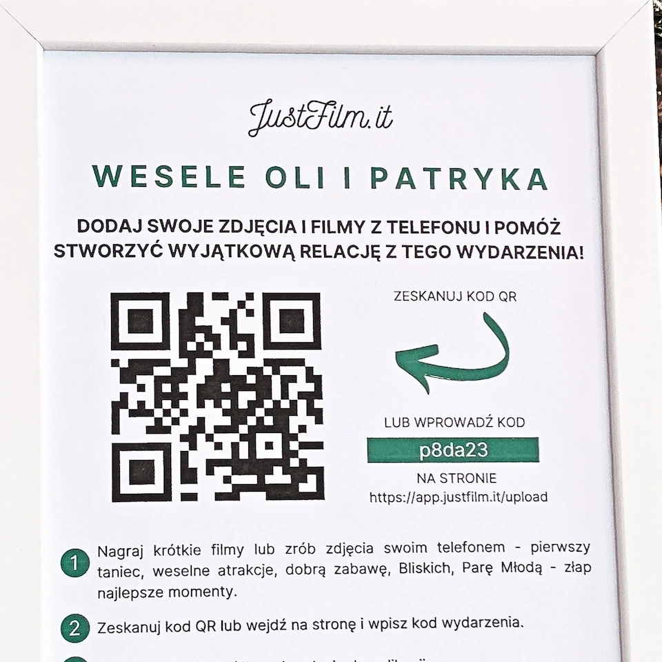Cyfrowa fotobudka to część aplikacji weselnej JustFilm.it. Jeden kod QR otwiera dostęp do galerii live, fotobudki i strony weselnej - wszystko w jednym miejscu.