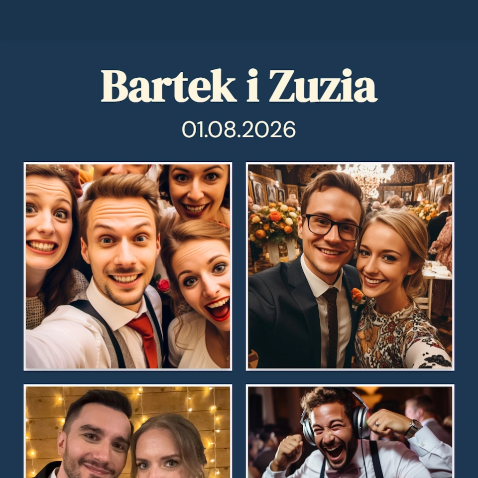 Wyobraź sobie, że Twoi Goście skanują kod QR przy stole i w kilka sekund mają w telefonie gotową fotobudkę z pięknymi, personalizowanymi ramkami. Robią zdjęcia z przyjaciółmi, a każda fotka automatycznie ląduje w Waszym wspólnym albumie weselnym - bez żadnej kolejki, bez czekania na wydruk, bez obsługi.